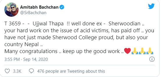 अमिताभ बच्चनले गरे नेपाल सरकार र उज्ज्वल थापाको प्रशंसा