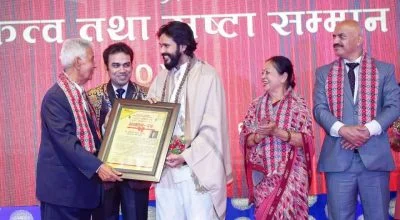 काठमाडौं- राष्ट्रिय युवा प्रतिभा सम्मान २०७७ बाट सम्मानित नेपालका चर्चित पेजेन्ट कोरियोग्राफर अश्विनी कान्त झा लाई सम्मान गरिएको छ । झा लाई “राष्ट्रलाई पुर्याएको योगदान विशिष्ट व्यक्तित्व तथा स्रष्टालाई विशेष
