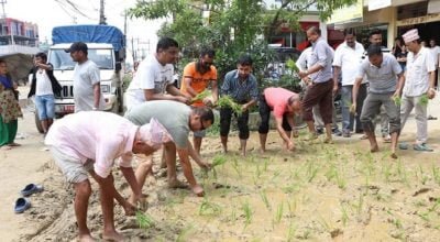 विर्तामोड – सडक बेलामा मर्मत नभएको विरोध गर्दै विर्तामोडस्थित भद्रपुर रोडमा स्थानीय बासिन्दाले सडकमै धान रोपेका छन्। झापाको सदरमुकाम भद्रपुर जाने सडक लामो समयदेखि जीर्ण भएको थियो। यसैप्रति आक्रोश पोख्न