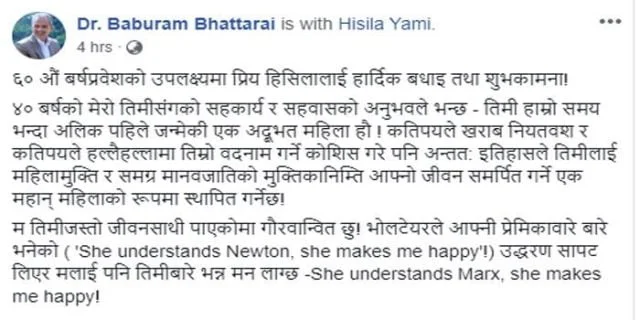 हिसिला जस्तो जीवनसाथी पाएकोमा आफू गौरवान्वित भएको कुरा बताउँदै भोलटेयरले आफ्नी प्रेमिकावारे बारे भनेको उद्धरण सापट लिएर भट्टराईले हिसिलाको बारेमा ”तिमी माक्र्स बुझौं र मलाई खुशी बनाउँछौं” भन्ने शुभकामना दिएका छन् ।