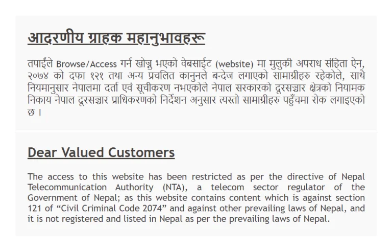 उक्त साइट खोल्दा लेखिएको छ, ‘आदरणीय ग्राहक महानुभावहरू, तपाईंले Browse/Access गर्न खोज्नु भएको वेबसाईट (website) मा मुलुकी अपराध संहिता ऐन, २०७४ को दफा १२१ तथा अन्य प्रचलित कानुनले बन्देज लगाएको सामाग्रीहरु रहेकोले, साथै नियमानुसार नेपालमा दर्ता एवं सूचीकरण नभएकोले नेपाल सरकारको दूरसञ्चार क्षेत्रको नियामक निकाय नेपाल दूरसञ्चार प्राधिकरणको निर्देशन अनुसार त्यस्तो सामाग्रीहरु पहुँचमा रोक लगाइएको छ ।’