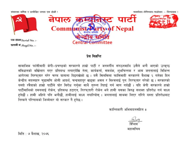 पार्टीका महासचिव विप्लवले एक विज्ञप्ति जारी गर्दै गिरफ्ता परेका आफ्ना नेता तथा कार्यकर्ताको नगरे वर्तमान सरकार विरुद्ध सशक्त प्रतिरोध गर्ने चेतावनी दिएका छन् ।
