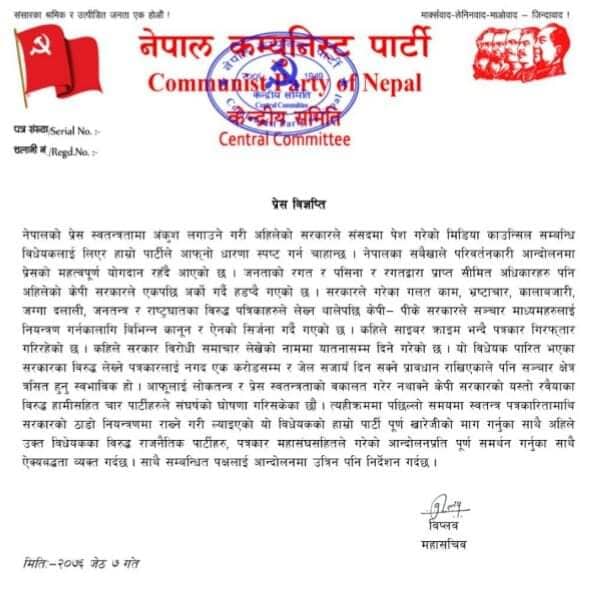 मंगलबार एक विज्ञप्ति जारी गर्दै विप्लव नेतृत्वको नेकपाले नेपालका सबैखाले परिवर्तनकारी आन्दोलनमा प्रेसको महत्वपूर्ण योगदान रहँदै आएको बताएको छ ।