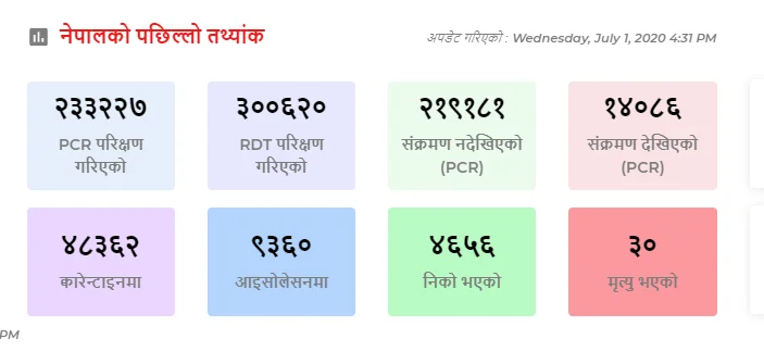 कोरोना संक्रमण निको भएर घर फर्किनेको संख्या ४६५६ पुगेको छ । नेपालमा ३० जनाको कोरोनाकै कारण मृत्यु भैसकेको छ ।