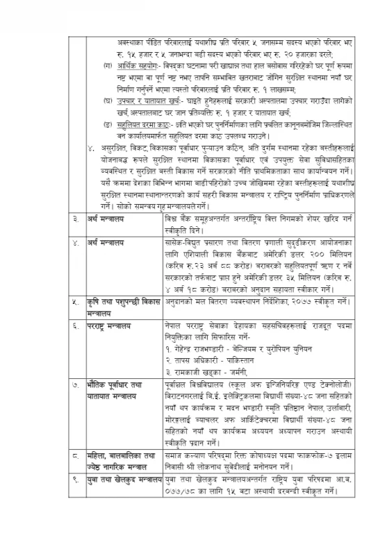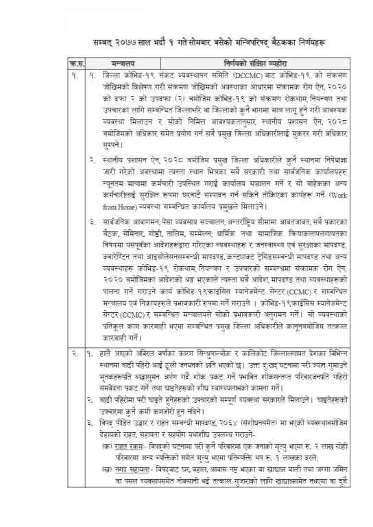 विपद्बाट घरबहाल नष्ट भएका र खाद्यान्न बाली तथा जग्गा जमिन र पसल व्यवसायसमेत नष्ट भएकाहरुको हकमा प्रति पाँचजानाको परिवारलाई १५ हजार रुपैयाँ र पाँचजनाभन्दा बढीको परिवार भएमा प्रतिपरिवार २० हजार रुपैयाँ सहयोग गर्ने निर्णय सरकारले गरेको उनले बताए ।