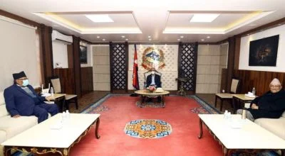 ओली र प्रचण्ड एकसाथ बालुवाटार छिरे, देउवासँग छलफल जारी
