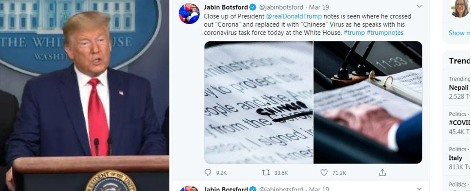 बिहीबार कोराना भाइरससम्बन्धी प्रेस ब्रिफिङमा ट्रम्पले लिखित नोटमा ‘कोरोना’ मेटेर ‘चाइनिज भाइरस’ लेखेको तस्वीर द वासिङटन पोस्टका फोटाग्राफर ज्याबिन बोट्सर्फडले सार्वजनिक गरिदिएका हुन् ।