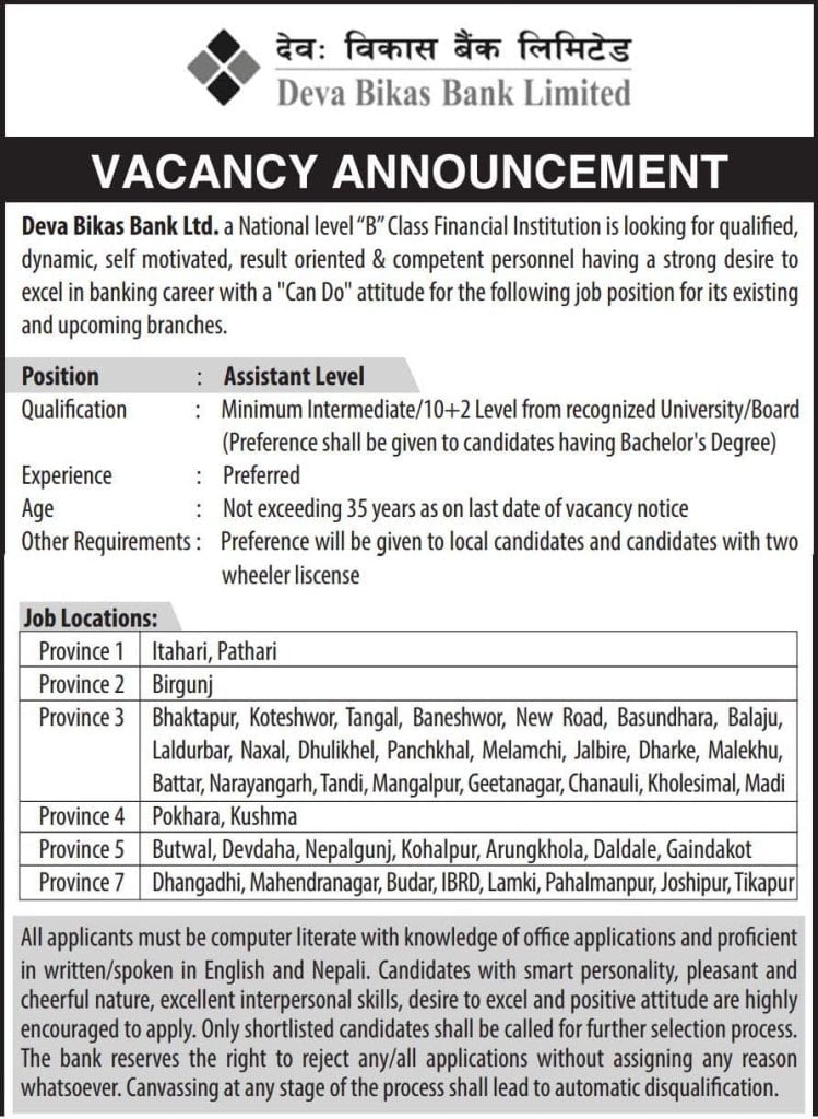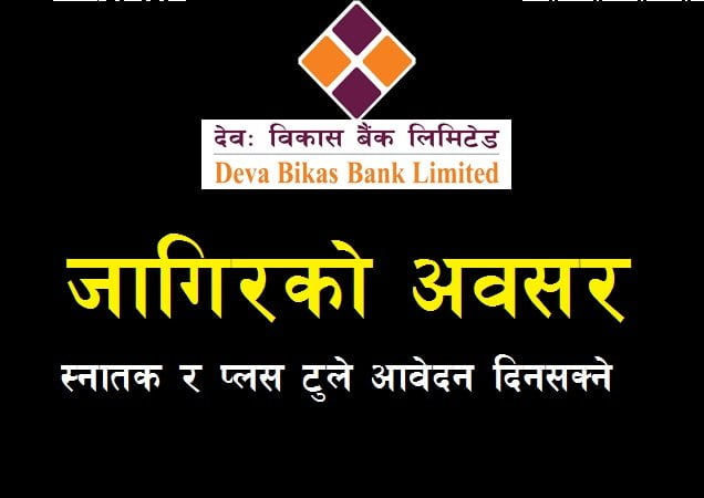 काठमाडौं, देव विकास बैकले ठूलो संख्यामा कर्मचारी माग गरेको छ । स्नातक तथा प्लस टु उत्तीर्ण गरेकाले आवेदन दिन सक्ने छन् । विस्तृत जानकारीका लागि बैंकको तलको विज्ञापन हेर्नुस् ।