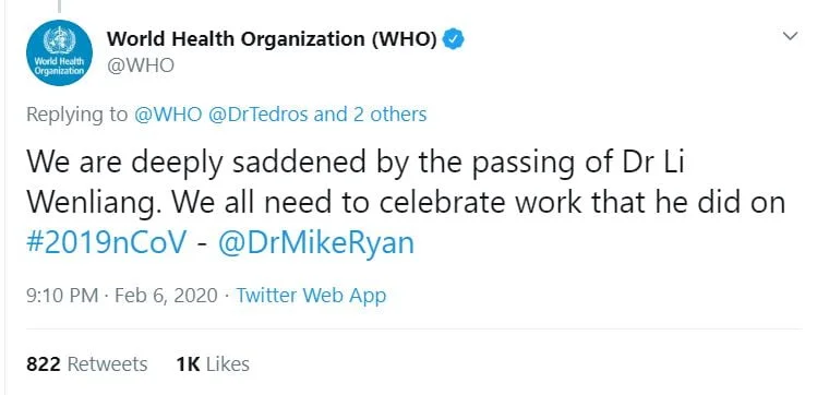 चीनमा यो भाइरसबारे सबैभन्दा पहिला खुलासा गर्ने उनलाई कारबाही भएको थियो । यी डाक्टरले कोरोना भाइरसबारे पहिला नै भविष्यवाणी गरेका थिए । तर साेही भाइरसका कारण उनकाे ज्यान गएकाे छ ।