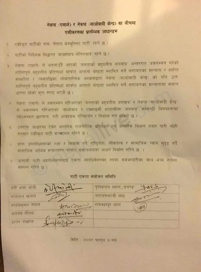ने.क.पा.(एमाले) र ने.क.पा. (माओवादी केन्द्र) का वीचमा एकीकरणका प्रारम्भिक आधारहरु