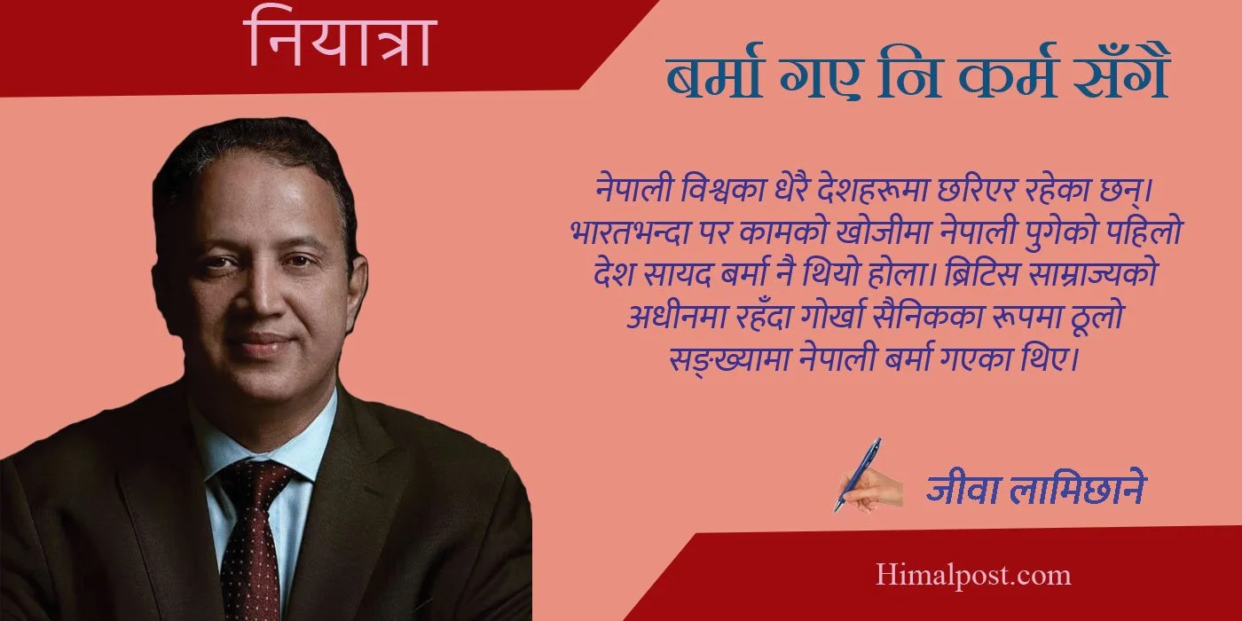 बा भन्नुहुन्थ्यो, बर्मा गए नि कर्म सँगै। यो उखान उहिल्यैदेखि धेरैका बाआमाले भन्दै आएका हुन्। मैले पनि सानै उमेरमा सुनेको हुँ तर यसको भाव भने बुझेको थिइनँ। स्कुल पढ्दा बल्ल बर्मा भनेको देश हो भन्ने थाहा भयो। पछि थाहा पाएँ, बर्मामा नेपाली पनि बस्ता रहेछन्। अहिले लाग्छ, बर्मामा पनि नेपाल छ। त्यहाँका नेपालीको मन, भाषा र भावमा नेपाल छ।