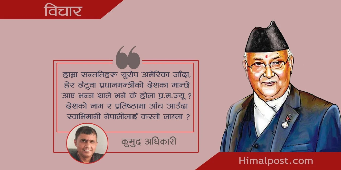 हाम्रा सन्ततिहरू युरोप अमेरिका जाँदा, हेर ढँटुवा प्रधानमन्त्रीको देशका मान्छे आए भन्न थाले भने के होला प्र.म. ज्यू ? देशको नाम र प्रतिष्ठामा आँच आउँदा स्वाभिमानी नेपालीलाई कस्तो लाग्ला ? सात कक्षा पढ्ने दुई साना भाइहरू हिन्दीभाषी भारतमा गएर, हिन्दी भाषाका गीत गाएर तेस्रो र चौथो भएर आए(स्मरणयोग्य कुरा हाम्रो मातृभाषा हिन्दी हैन, र उनीहरूले हिन्दी मातृभाषीसँग प्रतिस्पर्धा गरेर आएका हुन्)। उनीहरूलाई सिङ्गो जगतले आदरले नेपाली भनी हेर्दा, तपाईँको ‘सगरमाथाको भीड हल्ला हो!’ भन्ने विदेशी टेलिभिजनमा दिनुभएको अभिव्यक्तिलाई कसरी लिने, कसरी चित्त बुझाउने ? उत्तर पाऊँ प्र.म.ज्यू । उत्तर पाऊँ।