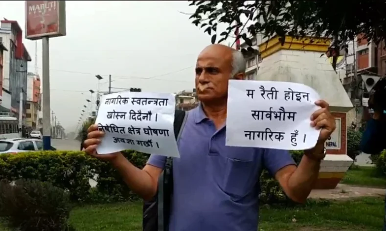 ‘नागरिक स्वतन्त्रता खोस्न दिँदैनौं निषेधित क्षेत्र घोषणा अवज्ञा गर्छौं’, ‘म रैती होइन सार्वभौम नागरिक हुँ’ लेखिएको प्ले कार्ड बोकेका थिए।