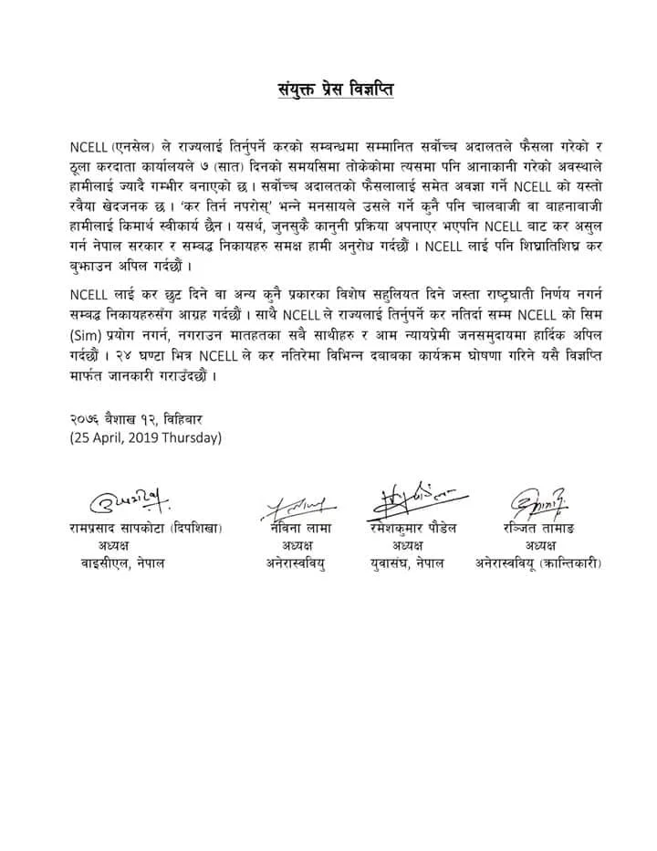 संयुक्त रुपमा चार संगठनका अध्यक्षहरुद्वारा जारी विज्ञप्तिमा भनिएको छ, ‘एनसेलले तोकिएको समयमा कर तिर्न आनाकानी गरेको अवस्थाले हामीलाई ज्यादै गम्भीर बनाएको छ । कर तिर्न नपरोस भन्ने मनसायका साथ एनसेलको यस्तो रवैया हामीलाई स्वीकार्य छैन् । यसर्थ जुनसुकै कानुनी प्रक्रिया अवलम्बन गरेर भए पनि एनसेलबाट कर असुल गर्न नेपाल सरकारसँग अनुरोध गर्दछौं ।’