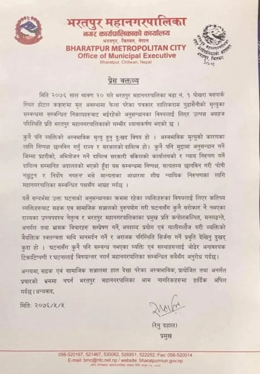 सामाजिक सञ्जालको दुरुपयोग गरेर कपोकल्पित, मनगढन्ते अनगर्ल तथा भ्रामक विचारहरु सम्प्रषण गर्ने, अपशब्द प्रयोग एवम् गालीगलौज गरी व्यक्तिको वैयक्तित स्वतन्त्रतामाथि मानमर्दन गर्ने र अराजक परिस्थिति सिर्जना गर्ने प्रवृत्ति देखिनु दुखद भएको दाहालले बिहीबार जारी गरेको विज्ञप्तिमा उल्लेख छ ।घटनासँग कुनै पनि सम्बन्ध नभएका व्यक्ति एवम् संस्थालाई जोडेर अनावश्यक टिकाटिप्पणी र घटनालाई विषयान्तर नगर्न पनि दाहालले सबैसँग अनुरोध गरेकी छिन् । महानगरपालिकाले घटनाको निष्पक्ष छानबिन गरी शीघ्र न्यायिक निरुपण गर्न पनि सबै पक्षसँग अनुरोध गरेको छ।