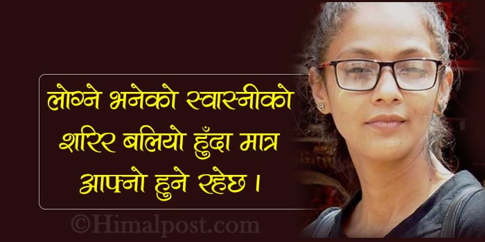एउटै घरका लोग्ने स्वास्नी लोग्ने राती अवेर आएर सजिलै भन्छ यार साथीहरु थिए आउनै दिएनन् त्यो समय श्रीमानले यो बुझ्दैनन् कि साथी त बुढीका नि छन् उ पनि यो समय सम्म बाहिर बसेर आईभने मेरो मनले के ठान्छ ? कतियप बिबाहित पुरुषका साथीहरुले घर छिटो जाने केटालाई जोईटिङ्ग्रे नि भन्दा रहेछन् । यहि डरले श्रीमतीलाई भन्दा बढि समय साथीभाईलाई दिने गरेको पाईन्छ । पुरुष स्वाभिमान भनेको आफ्नी स्वास्नी संग नझुक्नु हो र ? श्रीमतीको महत्वलाई प्रेम गरेर सकेजति माया र साथ दिनेहरु पो पुरुष । एउटी नारीको मनमा बस्न पाउनुनै पुरुषको ठुलो भाग्य हो, उसले जति प्रेम दिन्छ श्रीमतीले बदलामा उसलाई लाखौं गुणा बढि माया गर्न सक्छे । किनकी स्वभावैले नारी कोमल हुन्छन् । सबै पुरुषले आफ्ना श्रीमतीलाई यसरी माया गरिदीउँ की कहिल्यै श्रीमतीको मन र कानुनी दायरामा आफु बलत्कारीका रुपमा उभिनु नपरोस् ।