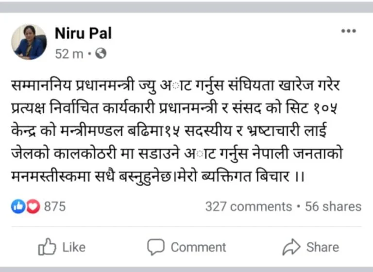 केहि समय अगाडी आफू लुटिएको भन्दै चर्चामा आएकी ओली समुहकी केन्द्रिय सदस्य निरु पालले संघियता खारेज गर्न र प्रत्यक्ष निर्वाचित कार्यकारी प्रधानमन्त्रीको व्यवस्था ल्याउन प्रधानमन्त्री ओलीलाई सुझाब दिएकी छन् ।