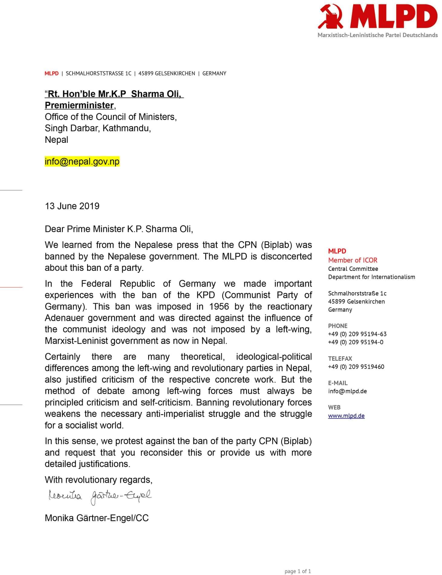 बिहीबार जर्मनको मार्क्ससिस्ट-लेनिनिस्ट पार्टीले प्रधानमन्त्री केपी शर्मा ओली तथा मन्त्रीपरिषदको कार्यालयलाई एक पत्र लेख्दै विप्लवमाथिको प्रतिबन्धको विरोध गर्नुका साथै उक्त प्रतिबन्ध पुनर्विचार गर्न आग्रह गरेको छ ।