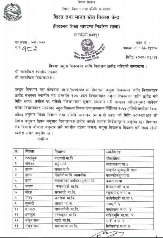बुधबार शिक्षा मन्त्रालयको शिक्षा तथा मानव स्रोत विकास केन्द्र अन्तर्गत रहेको विद्यालय शिक्षा मापदण्ड निर्धारण शाखाले बुधबार ती १०० विद्यालयलाई नमुना विकासका लागि छनोट गरेको हो।