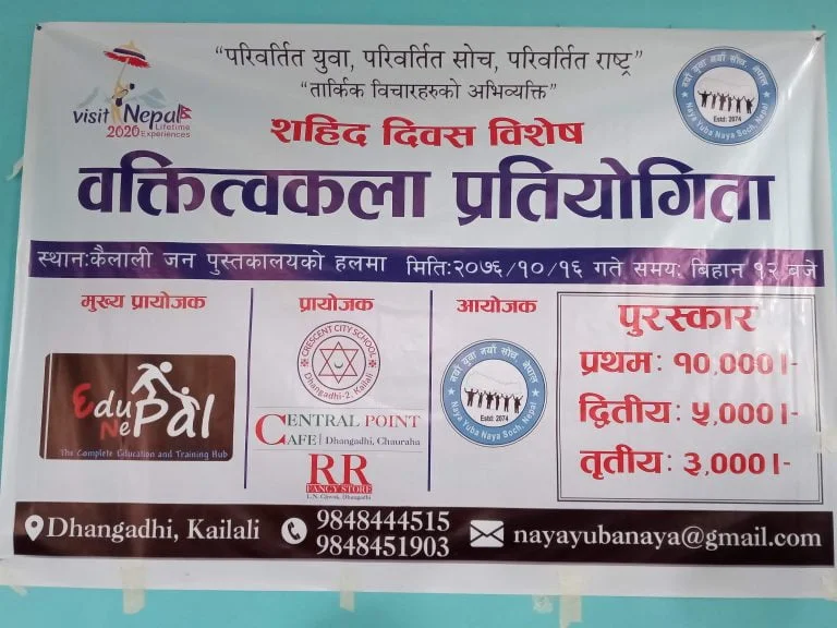 नयाँ युवा, नयाँ सोच नेपाल कैलाली इकाईको आयोजनामा तार्किक बिचारहरुको अभिव्यक्ति भन्ने नाराका साथ “बर्तवान नेपाल निर्माणमा सहिदको योगदान” बिषयमा वत्तित्वकला प्रतियोगिता भएको हो ।
