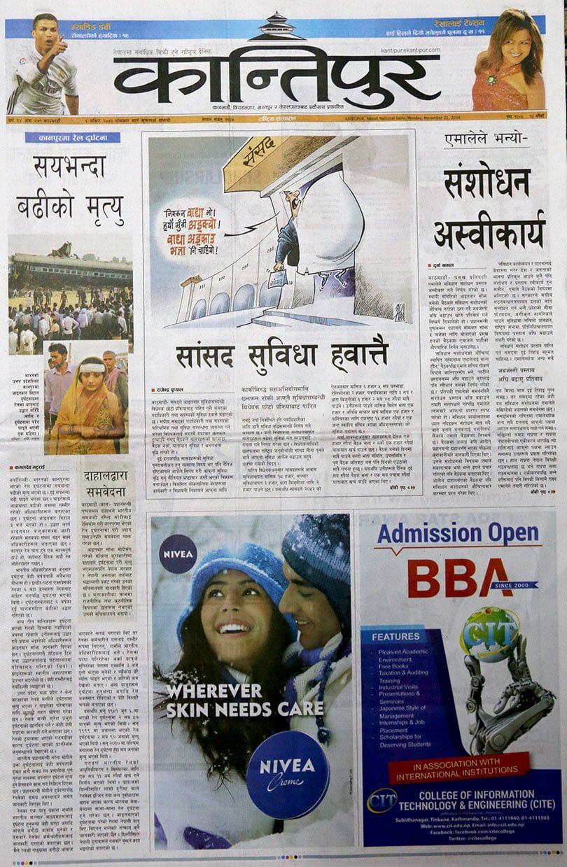 कान्तिपुर दैनिकः आजको कान्तिपुर दैनिकले ‘सांसद सुविधा ह्वात्तै’ शीर्षकमा समाचार बनाएको छ । त्यसैगरी ‘एमालेले भन्यो- संशोधन अस्वीकार्य’ शीर्षकमा कान्तिपुरमा अर्को समाचार छ । कान्तिपुरको फ्रन्ट फेजमा तीनवटा समाचार छापिएका छन् ।