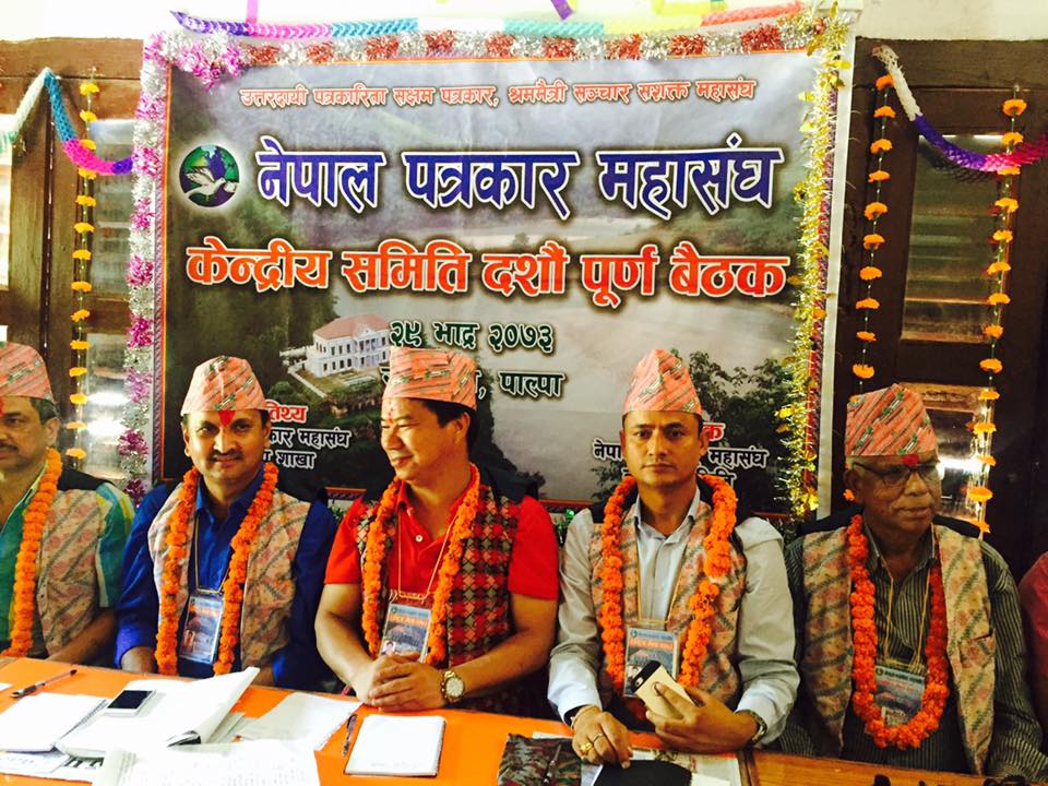 [su_heading size=”15″]श्रमजीवी पत्रकार ऐन र न्यूनतम पारिश्रमिक कार्यान्वयन गराउन आन्दोलनको घोषणा [/su_heading]काठमाडौं, नेपाल पत्रकार महासंघको पाल्पामा सम्पन्न राष्ट्रिय भेलाबाट संशोधित विधान जारी भएको छ । गत वैशाखमा चितवनमा आयोजित केन्द्रीय साधारणसभामा प्रस्तुत भएको विधान संशोधन प्रस्तावमा प्राप्त सुझावहरुलाई समावेशी गरी विधान संशोधन समितिका संयोजक एवं महासंघका पूर्वसभापति डा. सुरेश आचार्यले महासंघका अध्यक्ष डा. महेन्द्र विष्टलाई हस्तान्तरण गरेलगत्तै महासंघका जिल्ला एवं प्रतिष्ठान शाखा तथा एशोसियट अध्यक्षहरूको राष्ट्रिय भेलाबाट संशोधित विधान जारी गरिएको हो ।