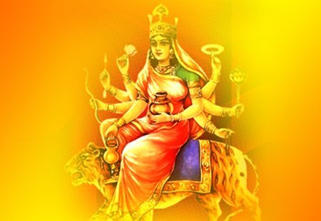 यी देवीको वदनवर्ण वैजनी छ भने उनी सिंहमा चढेकी छन् । कुष्माण्डा माताले हातमा रक्तपूर्ण दुई वटा घडा लिएकी छन् ।