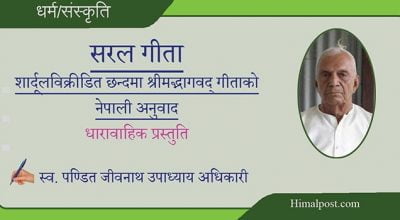 ~स्व. पण्डित जीवनाथ उपाध्याय अधिकारी~ श्रेयान्स्वधर्मो विगुणः परधर्मात्स्वनुष्ठितात्। स्वभावनियतं कर्म कुर्वन्नाप्नोति किल्बिषम्।।४७।। आफ्नू धर्म निकृष्ट नै किन नहोस् त्यै हुन्छ हित्कारक पाउन्नौ परधर्मबाट तिमीले कल्याणकारी फल। आफ्ना जाति निमित्त शास्त्रहरूमा