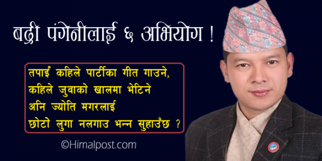 राष्ट्रिय लोक दोहोरी प्रतिष्ठानका अध्यक्ष समेत रहेका चर्चित लोक गायक बद्रि पंगेनीले पछिल्लो समय केही विवादहरू झेलेका छन् । कहिले ज्योति मगरलाई छोटा लुगा नलगाउ भनेर र कहिले जुवाको खालमा भेटिएको
