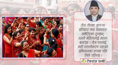 –टेकराज पन्थी नेपाली हिन्दू महिलाहरूको महान चाड हरितालिका तीजको चहलपहल एक महिना अघि देखि शुरू गरिरहेको अवस्था छ । तीज पर्व विशेष गरी हिन्दू नारीहरूले मनाउने एउटा महत्त्वपूर्ण चाड हो