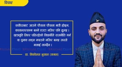 -डा. निकोलस भुसाल (कमल) म चिकित्सा क्षेत्रमा लागेको व्यक्ति हुँ तर पछिल्लो समय देशलाई निको पार्ने चिकित्सकको आवश्यकता महसुस भएकाले राजनीति र सेवामा होमिएको युवा हूँ। हाम्रो लागि न्यायको मन्दिर