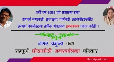 नयाँ बर्ष २०७६ सालको अवसरमा हाम्रा सम्पूर्ण नगरवासी, शुभेच्छुक, कर्मचारी, सहयोगीहरुसहित सम्पूर्ण नेपालीहरुमा हार्दिक मंगलमय शुभकामना व्यक्त गर्दछौ । नयाँ वर्षले नयाँ हर्ष र नयाँ उत्साहको सृजना गरोस, सम्बृद्ध नेपालको