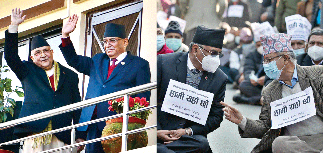 दुई वर्षपछि बालकोट पुगेका प्रचण्डलाई ओलीले प्रसन्न मुद्रामा स्वागत गरेको तस्बिर थियो। जुन दिन ओलीले प्रचण्डलाई प्रसन्न मुद्रामा स्वागत गरेका थिए, ठीक दुई वर्षअघि आजकै दिनको तस्बिर (दोस्रो तस्बिर) भने फरक थियो। दुई वर्षअघि तत्कालीन नेपाल कम्युनिस्ट पार्टीको विवाद उत्कर्षमा पुग्दा प्रचण्ड र हाल नेकपा (एकीकृत समाजवादी)का अध्यक्ष माधवकुमार नेपाल ‘हामी यहाँ छौँ’ भन्ने नारा छातीमा टाँसेर माइतीघरमा सडक धर्नामा थिए।