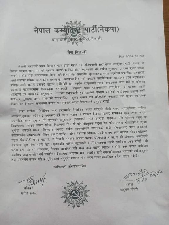 घोडाघोडीमा भएका अपराधिक घटनाप्रति नेकपाको ध्यानाकर्षण