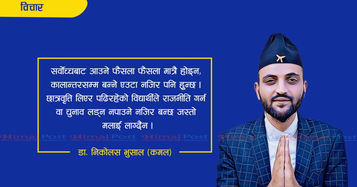 सर्वोच्चबाट आउने फैसला फैसला मात्रै होइन, कालान्तरसम्म बन्ने एउटा नजिर पनि हुन्छ । छात्रवृत्ति लिएर पढिरहेको विद्यार्थीले राजनीति गर्न वा चुनाव लड्न नपाउने नजिर बन्छ जस्तो मलाई लाग्दैन ।