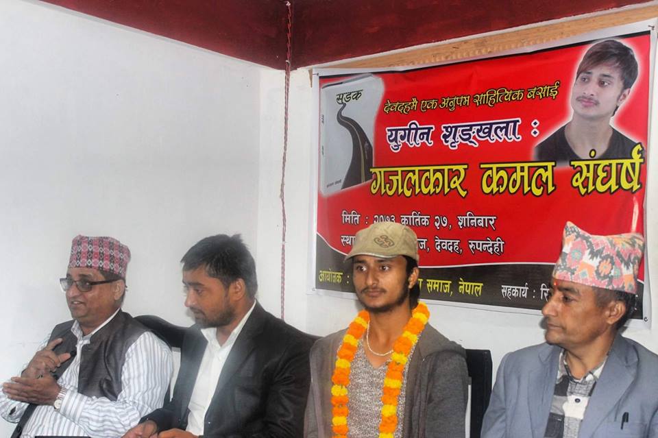 युवा गजलकार कमल संघर्षकाे विशेष गजल बाचन कार्यक्रम देवदहमा सम्पन्न भएकाे छ । युगिन साहिल्य समाज देवदह ,रुपन्देहीको अायाेजनामा भएकाे कार्यक्रममा कमल संघर्षका २ दर्जन बढि गजल सुनिएका थिए ।