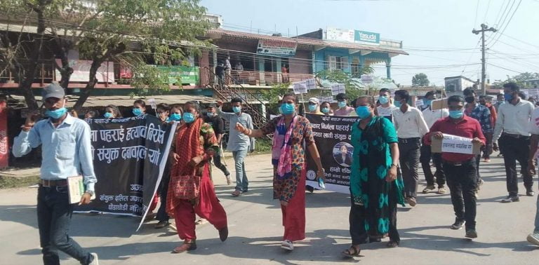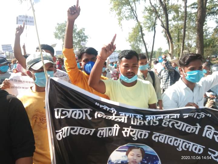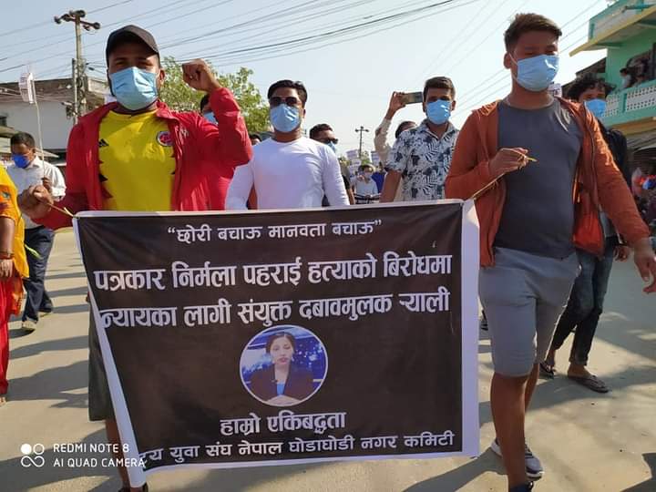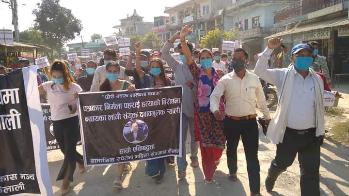 कैलाली – कैलालीको घोडाघोडी नगरपालिका -५ मा गत असोज २ गते रुखमा झुण्डिएको अवस्थामा फेला परेकी पत्रकार निर्मला पहराईको न्यायको माग गर्दै प्रदर्शन गरिएको छ । घोडाघोडीमा रहेको संयुक्त दलित जनजागरण मञ्चको अगुवाईमा निस्पक्ष अनुसन्धान तथा न्यायको माग राख्दै मंगलबार कैलालीको सुखडमा प्रदर्शन गरिएको हो । प्रदर्शनमा राष्ट्रिय युवा संघ नेपाल ,घोडाघोडी नगर कमिटी, सामाजिक सचेतना महिला संजाल लगायतले एकिबद्बता जनाएका थिए ।