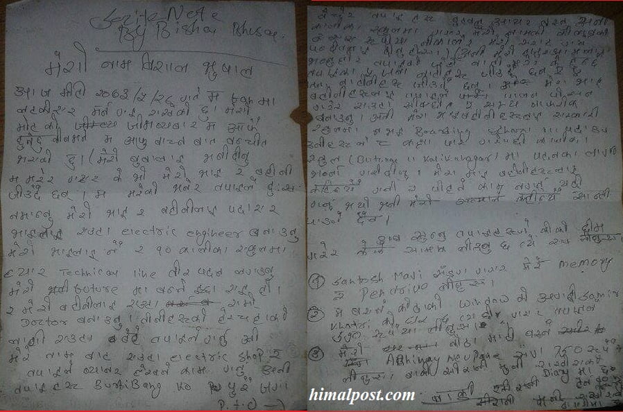 बुबालाई यस्तो पत्र लेखेर ९ मा पढ्ने बिशालले गरे आत्महत्या !