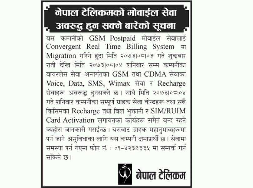 टेलिकमले जारी गरेको एक सूचनामा शुक्रबार रातिदेखि वायरलेस सिस्टमका जीएसम तथा सिडिएमए सेवामा भ्वाइस कल, एसएमएस, डाटा, रिचार्ज र वाइम्याक्स सेवा अवरुद्ध हुने जनाएको छ ।
