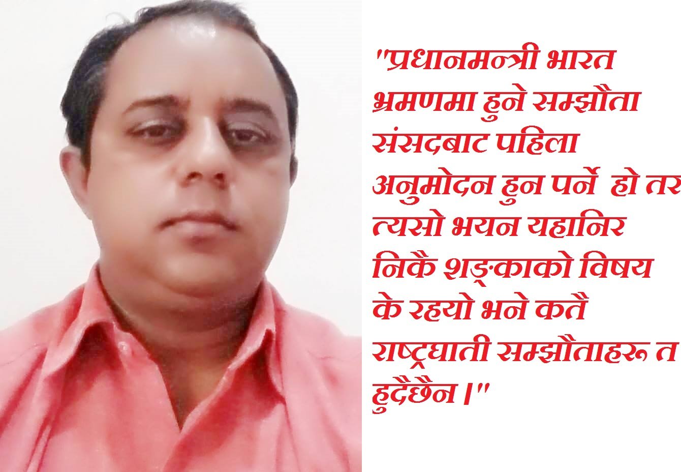प्रधानमन्त्री भारत भ्रमणमा हुने सम्झौता संसदबाट पहिला अनुमोदन हुन पर्ने हो तर त्यसो भयन यहानिर निकै शङ्काको विषय के रहयो भने कतै राष्ट्रघाती सम्झौताहरू त हुदैछैन ।